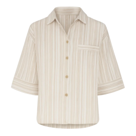 en oversized loose skjorte med et cool og afslappet twist af beige striber. Fremstillet i en let transparent vævet kvalitet, der falder smukt og behageligt omkring kroppen. Den har en løs pasform i one-size, der passer str. 34–40 med let A-silhuet og rummelig fornemmelse uden at være klodset