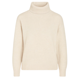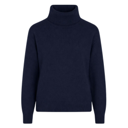 Designet har høj rullekrave og et enkelt snit, der giver et rent og stilfuldt look. Den dybe navyfarve tilfører et eksklusivt og alsidigt udtryk, som gør strikken nem at style både til hverdag og mere elegante outfits.