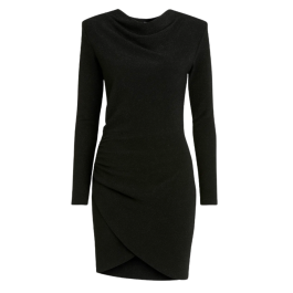 Opal Studio Mille Dress i sort er en elegant festkjole med et glitrende udtryk, der kombinerer komfort og stil. Den sofistikerede vandfaldsudskæring og de markerede skulderpuder giver kjolen en skulpturel og feminin silhuet, mens de diskrete draperinger i siden fremhæver figuren på en flatterende måde.