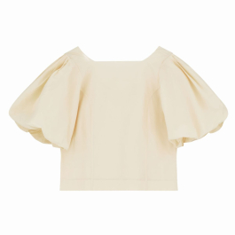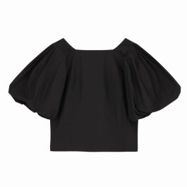 Blusen er designet med firkantet halsudskæring, som smukt indrammer kravebenet, samt en dyb ryg, der tilfører et eksklusivt og feminint element. De voluminøse ballonærmer skaber en markant silhuet og giver modellen karakter og bevægelse.